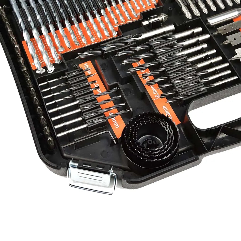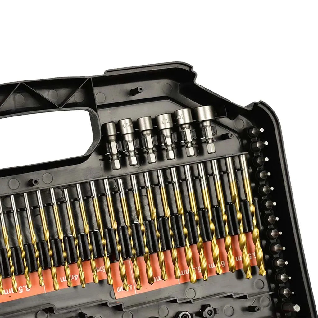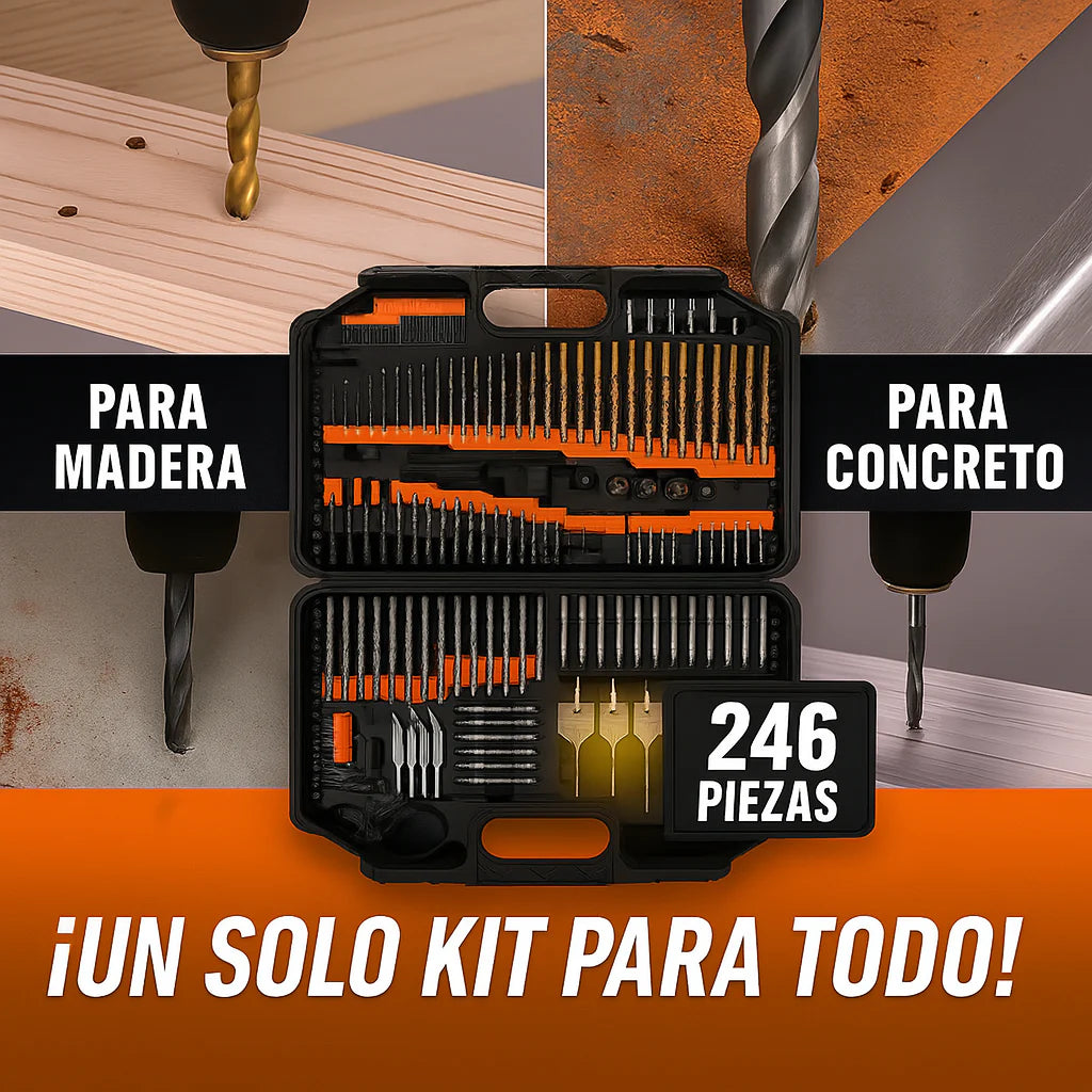 Incluye brocas HSS recubiertas de titanio, ideales para trabajos con madera y de mampostería, diseñadas para resistencia y precisión.