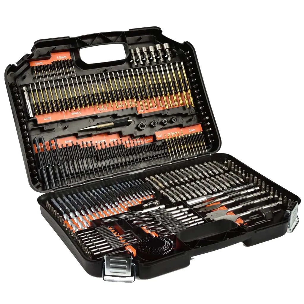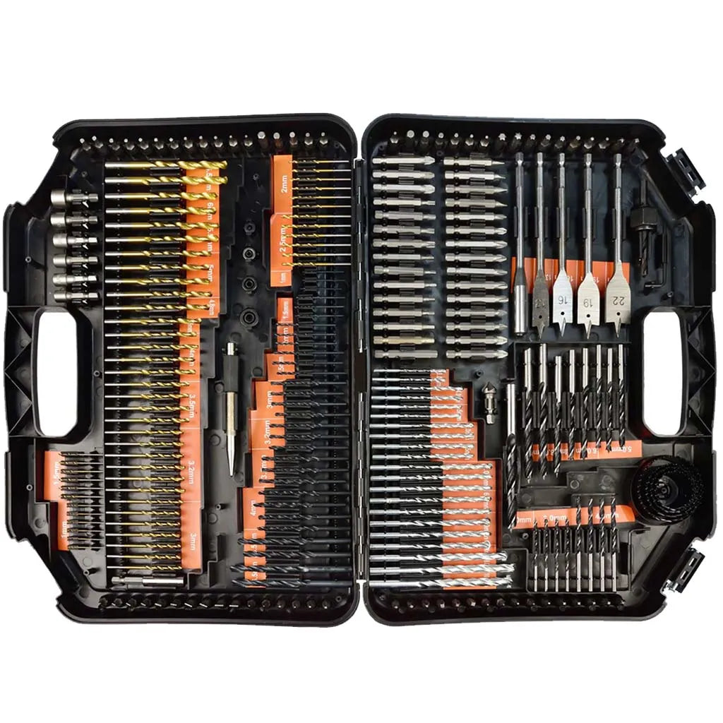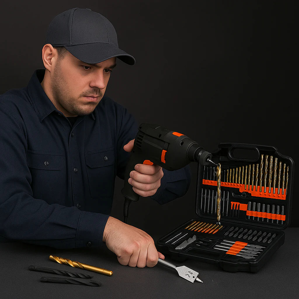 Incluye brocas HSS recubiertas de titanio, ideales para trabajos con madera y de mampostería, diseñadas para resistencia y precisión.
