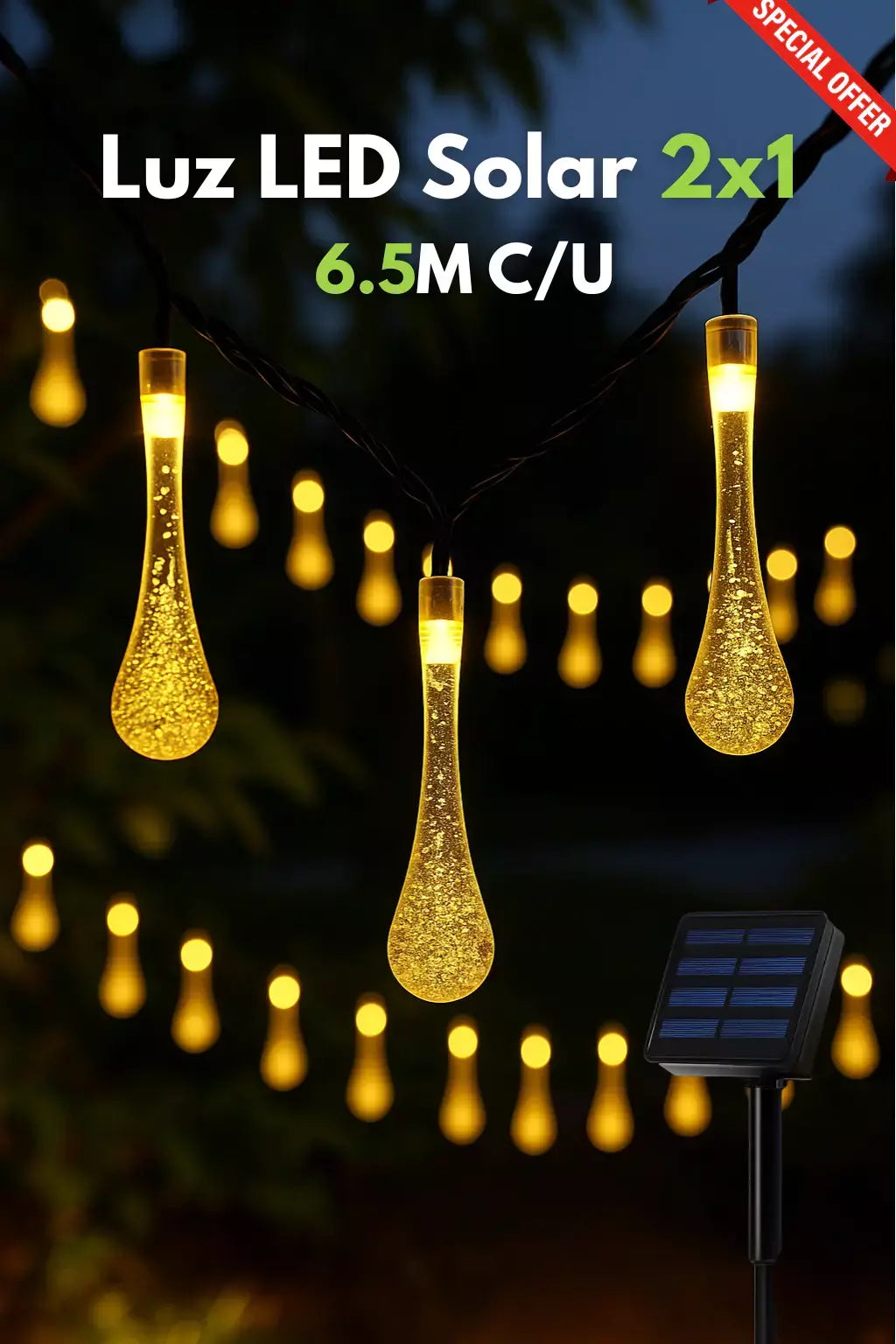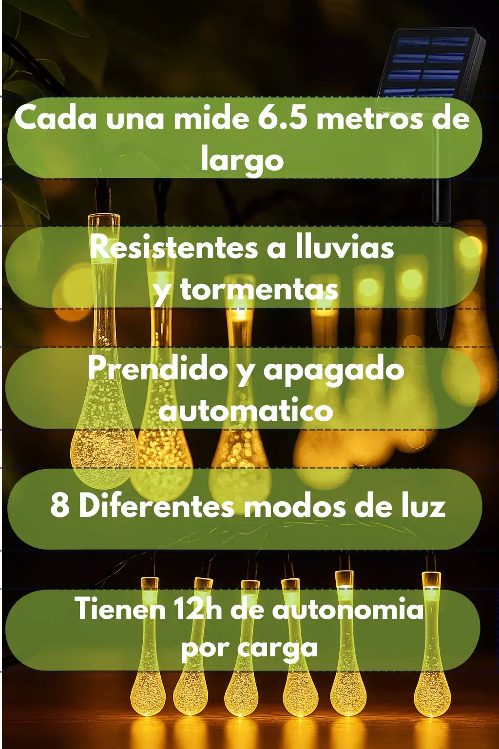 Cada guirnalda mide 6.5 metros, y el pack incluye 2 unidades, para un total de 13 metros de iluminación solar cálida.